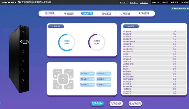安徽靜安中西醫(yī)結合醫(yī)院使用安德力士微模塊封閉冷通道系統(tǒng)1套,制冷方式采用行間空調進行制冷,使用模塊化UPS電源系統(tǒng)為IT設備供電。