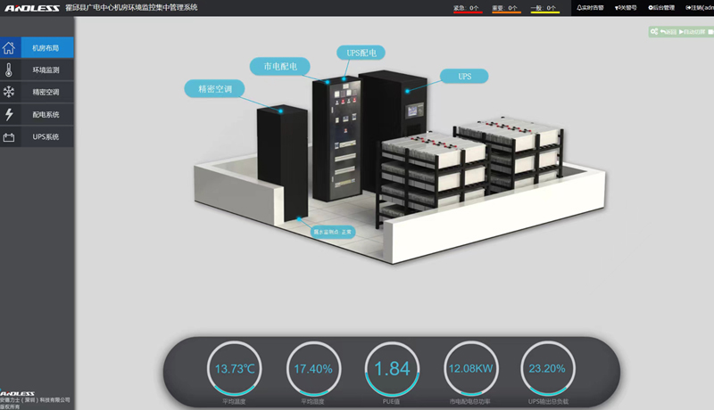 本項目使用安德力士UPS不間斷電源系統3套(1套GLS-300KVA模塊化UPS、1套GLE-100KVA工頻UPS、1套GLE-40KVA工頻UPS)、動力環境監測系統3套、精密空調2套,為用戶單位信息化建設提供保障。