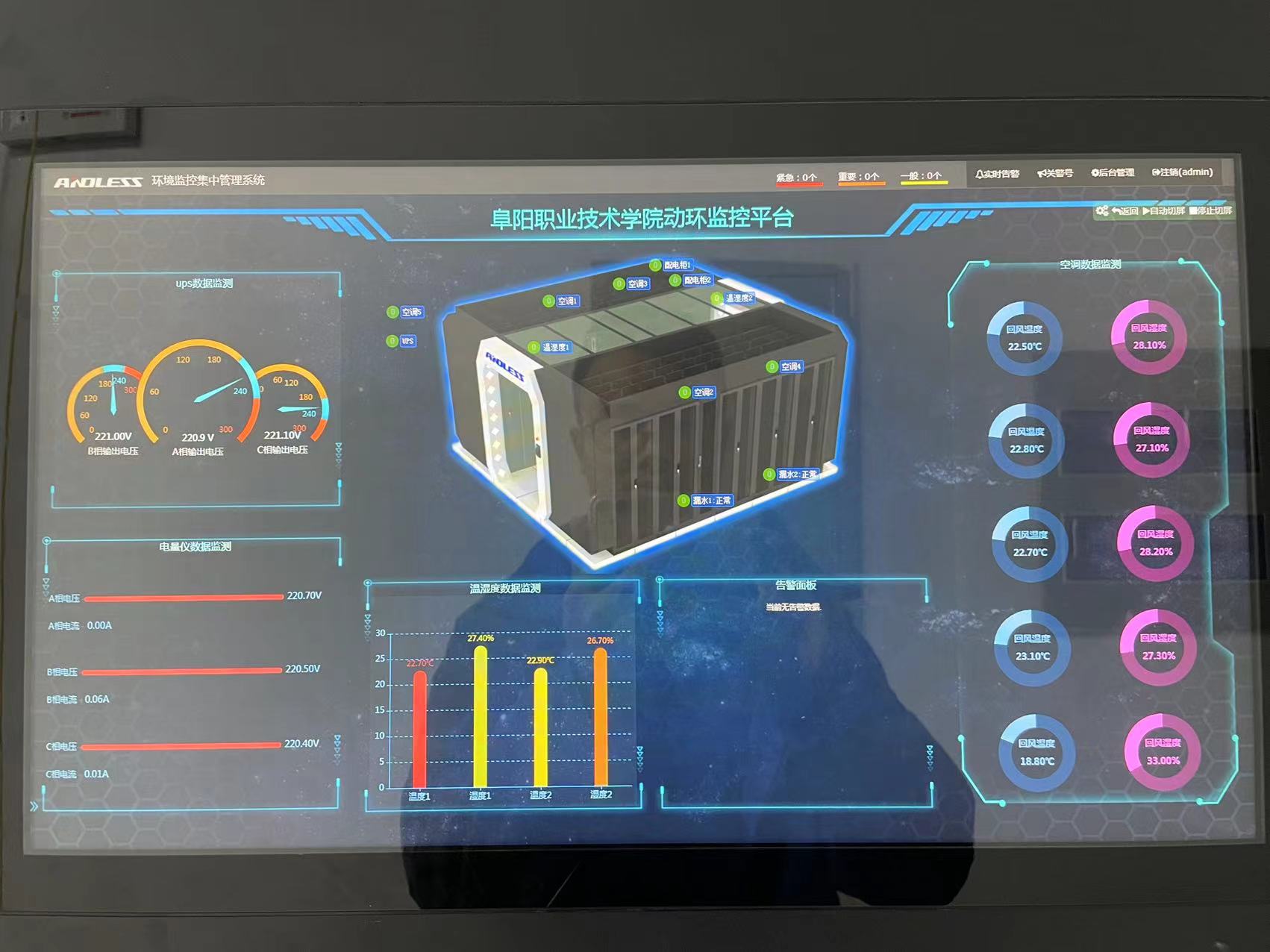 貴校使用我公司安德力士品牌GLM模塊化機房1套,配置模塊化GLS-160KVA UPS主機1套,房間級30KW精密空調1臺、40KW精密列間空調4臺、環境監控集中管理系統1套。機房環境監控是綜合機房整體分布環境的一個機房集中監控系統,是完整的室內集中監控系統。隨著信息技術的發展,計算機系統及通信設備數量與日俱增,規模也越來越大,中心機房、IDC等已成為各大單位業務管理的核心場所。為保證機房的安全正常工作,與之配套的動力系統、環境系統、安防系統、消防系統必須時時刻刻穩定協調運行。如果機房動力及環境設備出現故障,輕則導致計算機宕機,重則導致數據丟失等嚴重后果。因此,一套可對機房進行7x24小時實時監控的系統非常重要。機房監控是針對機房動力和環境的集中監控管理,其監控對象主要是機房動力和環境等設備(如:配電、UPS、空調、溫濕度、漏水、門禁、安防、消防、防雷等)。微模塊一體化集成機柜系統、供配電系統、制冷系統、監控系統和綜合布線系統等,微模塊具備一體化集成、安全可靠、低噪音、節省機房占地面積和節約能源、安裝省時、省力、省心、架構兼容、快速靈活部署、多種電源制式和完善的監控等特點,是新一代數據中心產品。GLS系列模塊化UPS電源擁有卓越的負載適應性能,對于各種類型的線性與非線性負載,均能提供強大的帶載能力。每個功率模塊以及機柜系統,均能提供媲美任何塔式機型的帶載能力,從而保證了此系列產品在各行業的應用范圍。系統中每個功率模塊均設計為可在線熱插拔,方便用戶安裝、維護以及升級擴容等需求。每個功率模塊均為自主控制,無單點故障風險。單個功率模塊在出現故障的情況下將自動退出,不影響其他模塊的工作以及系統的正常供電。GLS系列產品采用人性化的建議操作設計方案,用戶可以簡單明了地操作以及管理UPS系統。